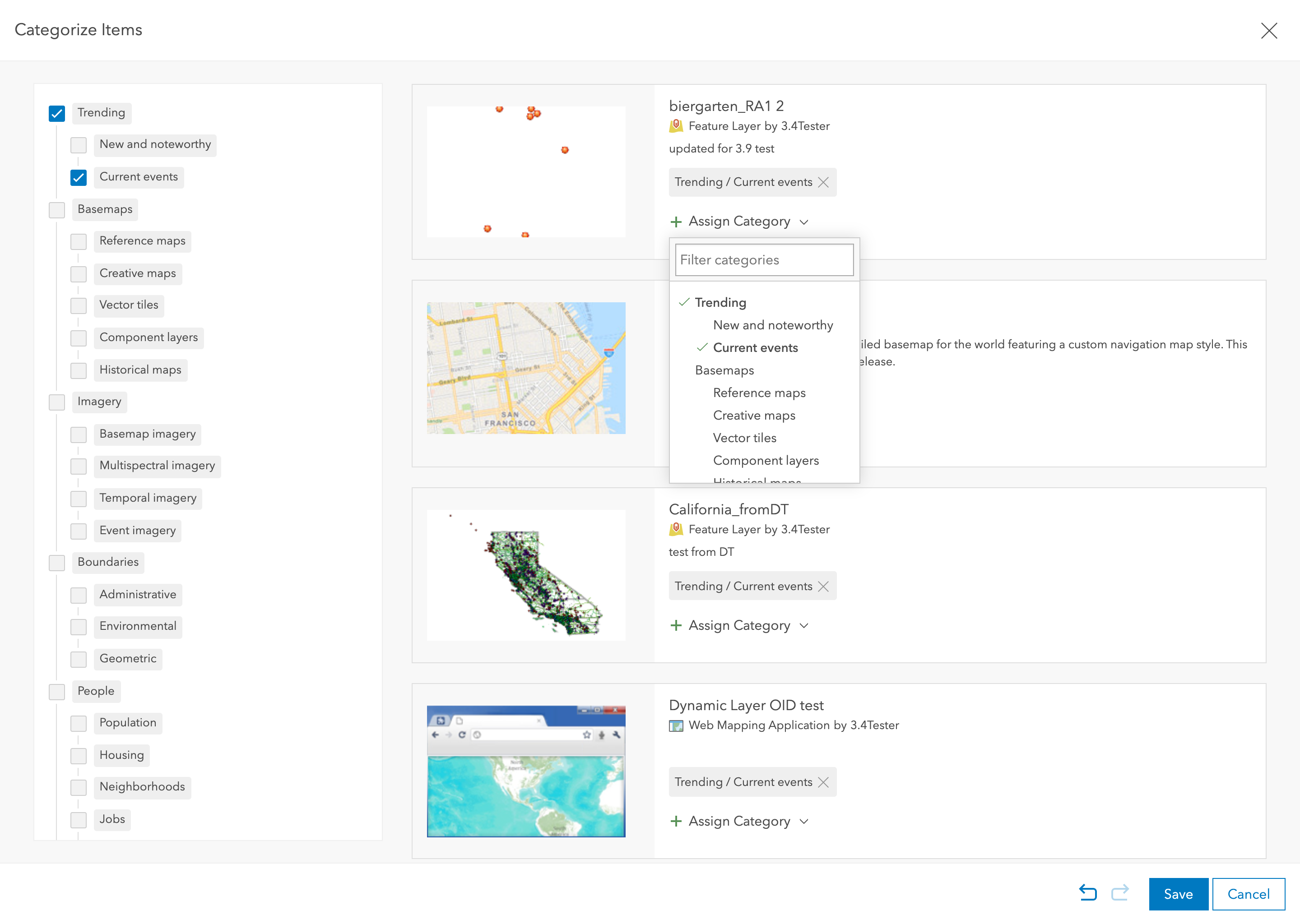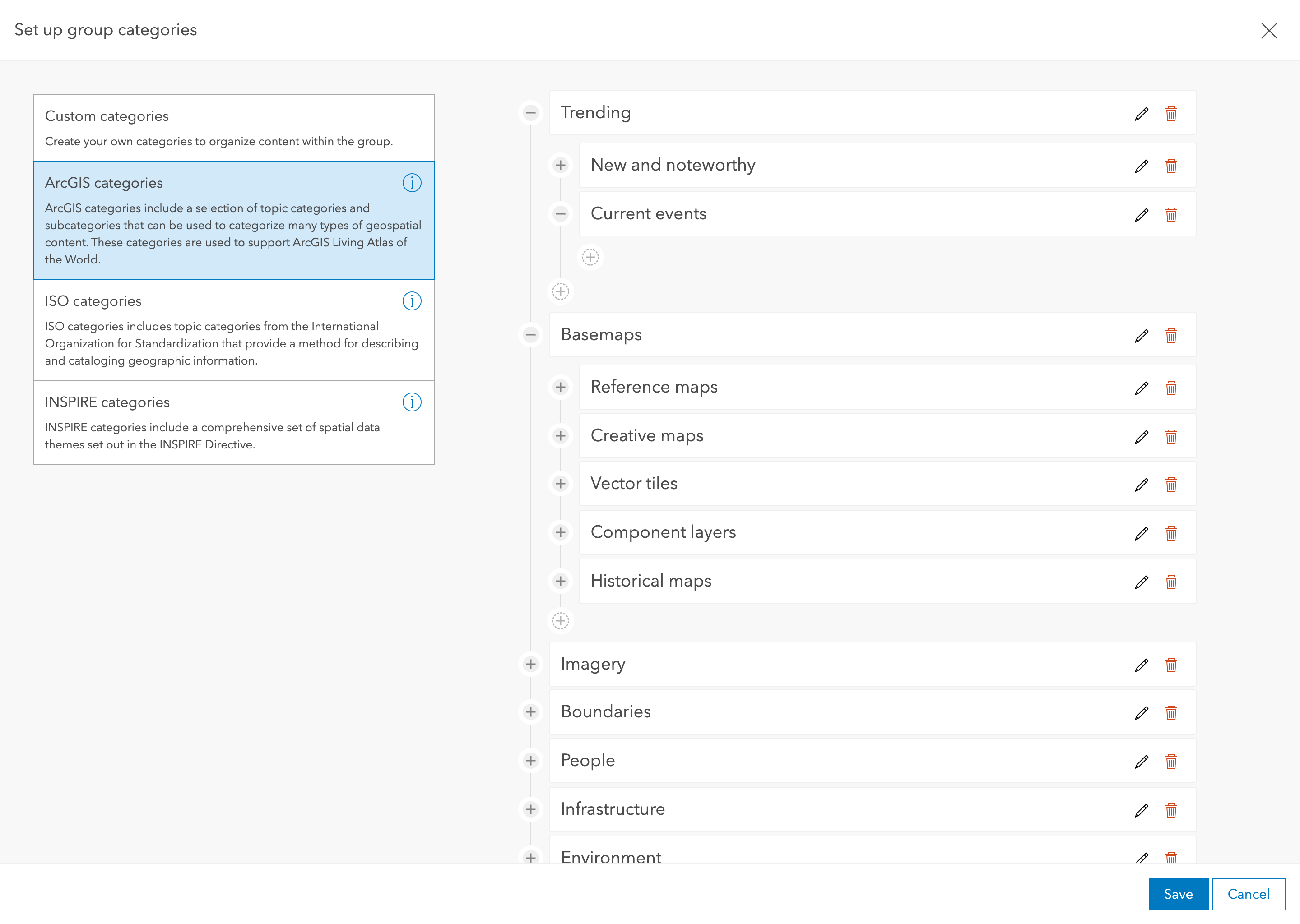 Content categories were a new way we introduced to organize content in a group or organization in ArcGIS Online. Content curators can establish hierarchical categories for content items by choosing from standard category templates (standard taxonomies), or by creating custom categories (domain-specific or project-specific taxonomies).