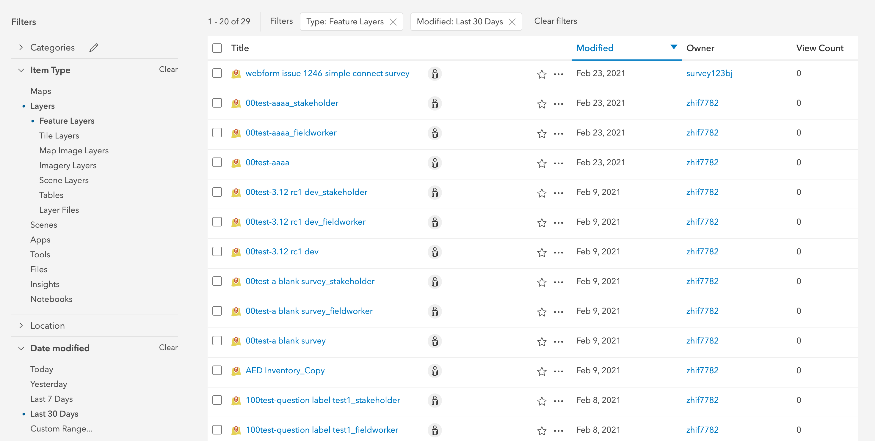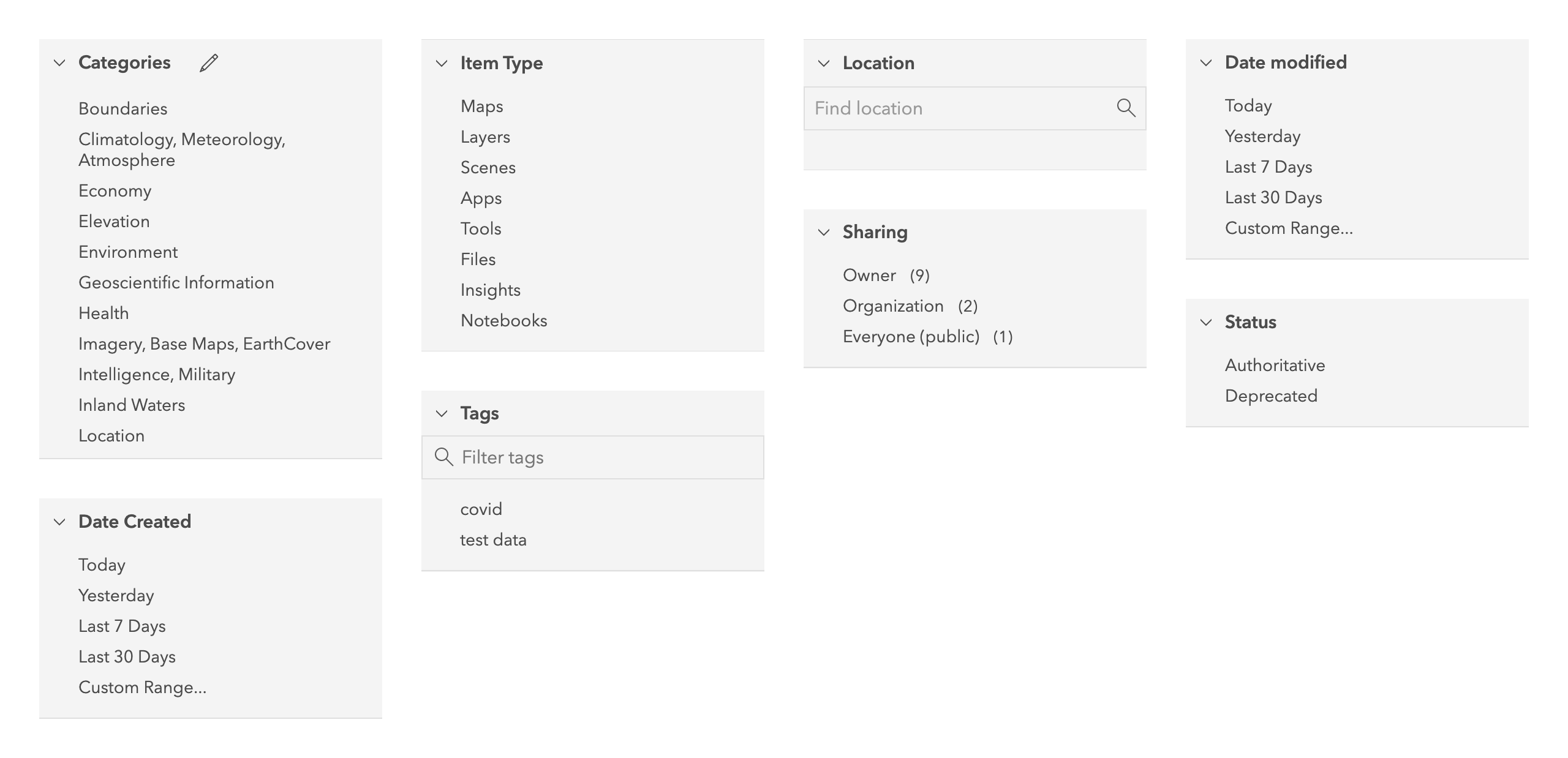 Although there are no direct equivalents of ArcGIS Online, file sharing products like Google Drive, Dropbox, and Box have similar content management features. Within Esri’s product ecosystem, ArcGIS Hub and Living Atlas of the World provide search and browse experience with filters, for view-only purposes. I made these observations from examining those products’ content management features: