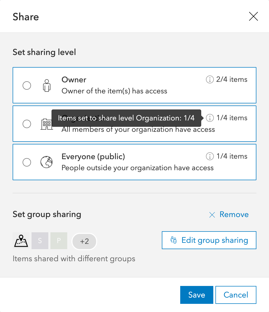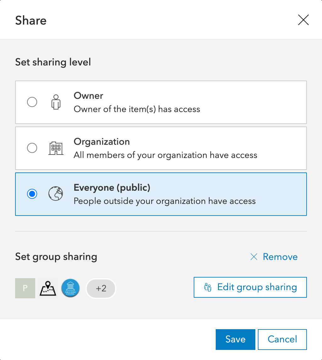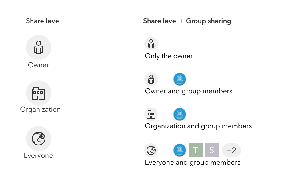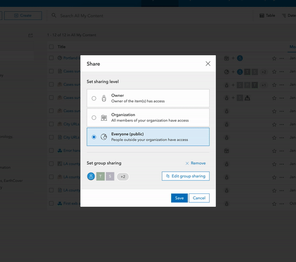 Sharing content in ArcGIS Online is not the common “share to social media” feature that you see everywhere, or the share dialog you see in Dropbox, Google Drive, or similar apps. Rather, in ArcGIS Online, a content item can be shared with its owner, within the organization, or with the public (everyone). Users can create groups and share content items to those groups. Therefore, a content item can have a complex sharing status.