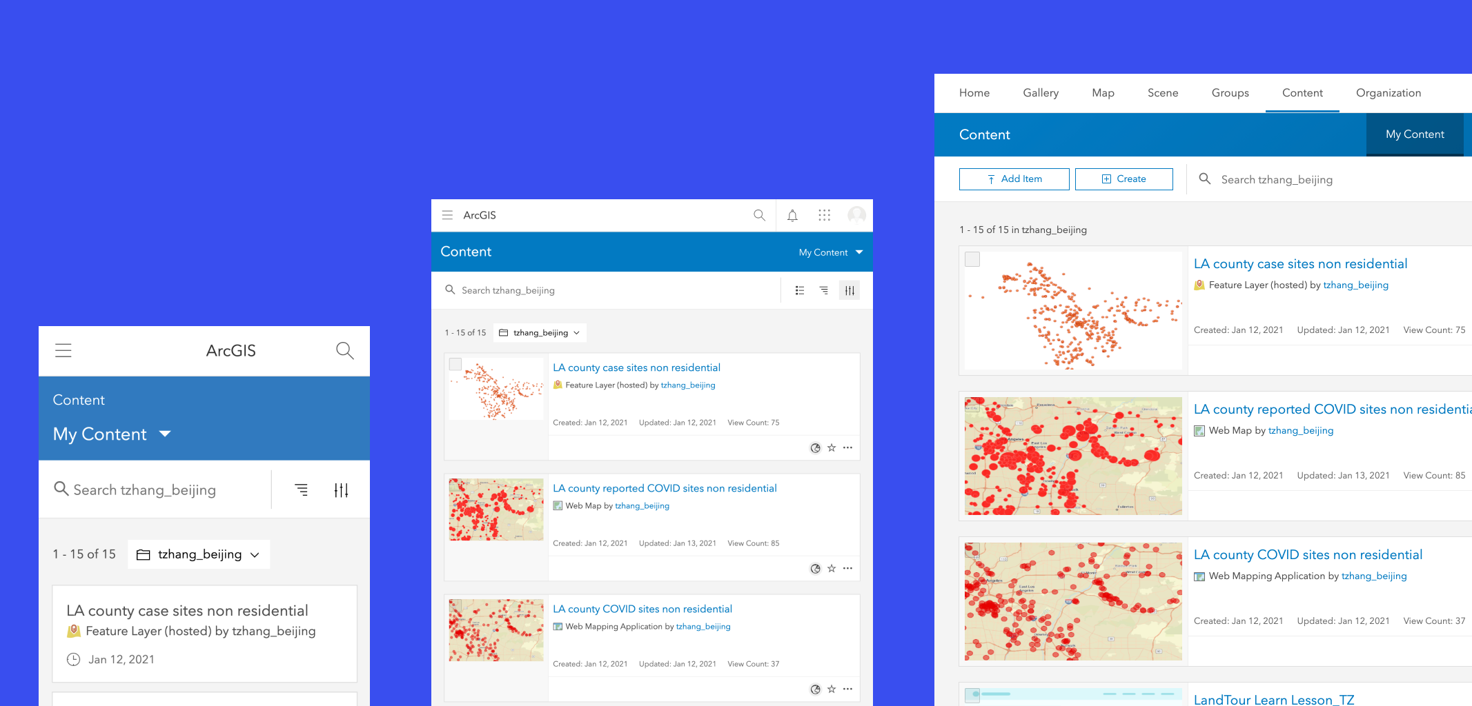 ArcGIS Online is a cloud-based mapping and analysis solution by Esri. Users use ArcGIS Online to make web maps, analyze geospatial data, and to share and collaborate. ArcGIS Online is also the main work space for users to search, access, and organize web-based mapping content, including the user’s own content, content of the user’s groups and organizations, content provided by Esri, and public content. Working with these different content scopes is a core part of the ArcGIS Online’s user experience.