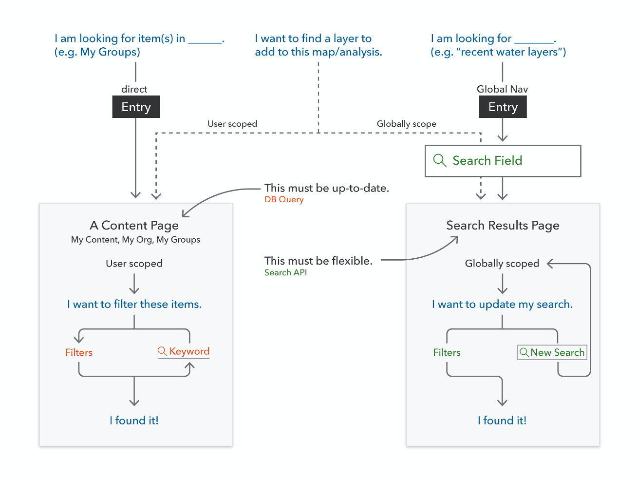 Through user research, I realized that there are actually two distinct search patterns: scoped search and global search. Scoped search finds content within a specific scope, and users wanted it to be fast and up to date. Global search finds content across all available scopes, and users would reformulate keywords to discover relevant content (for example, from “water layers” to “US water layers”).