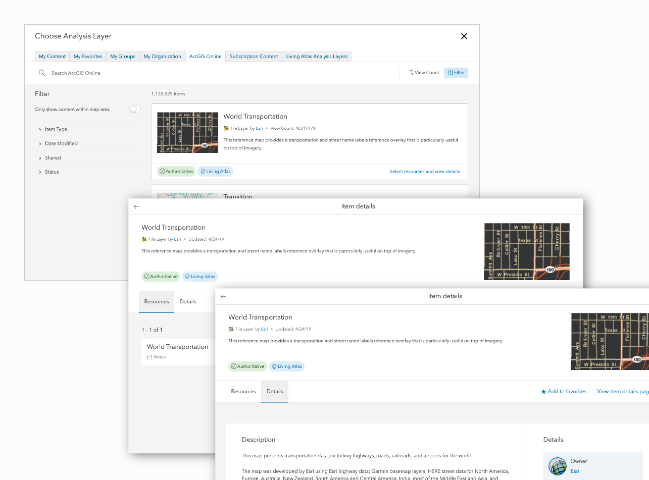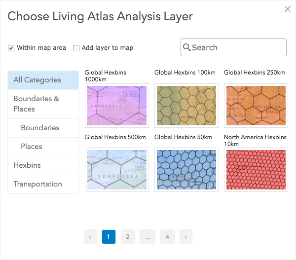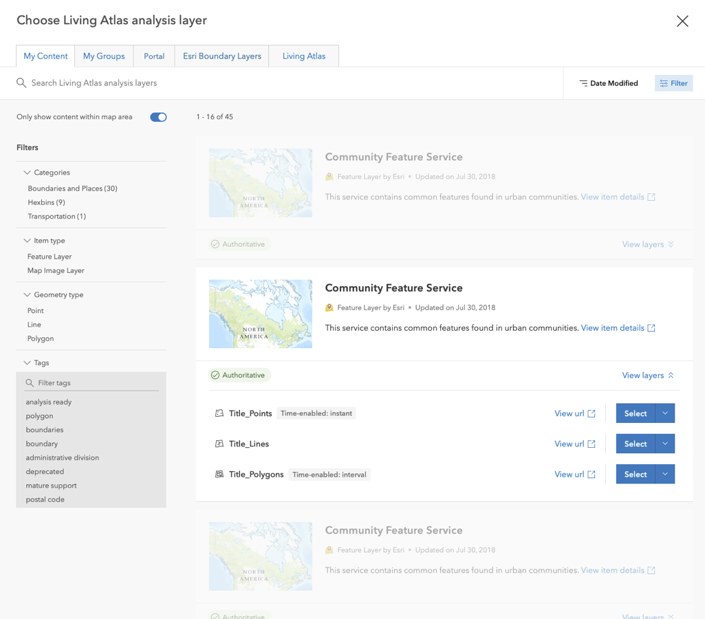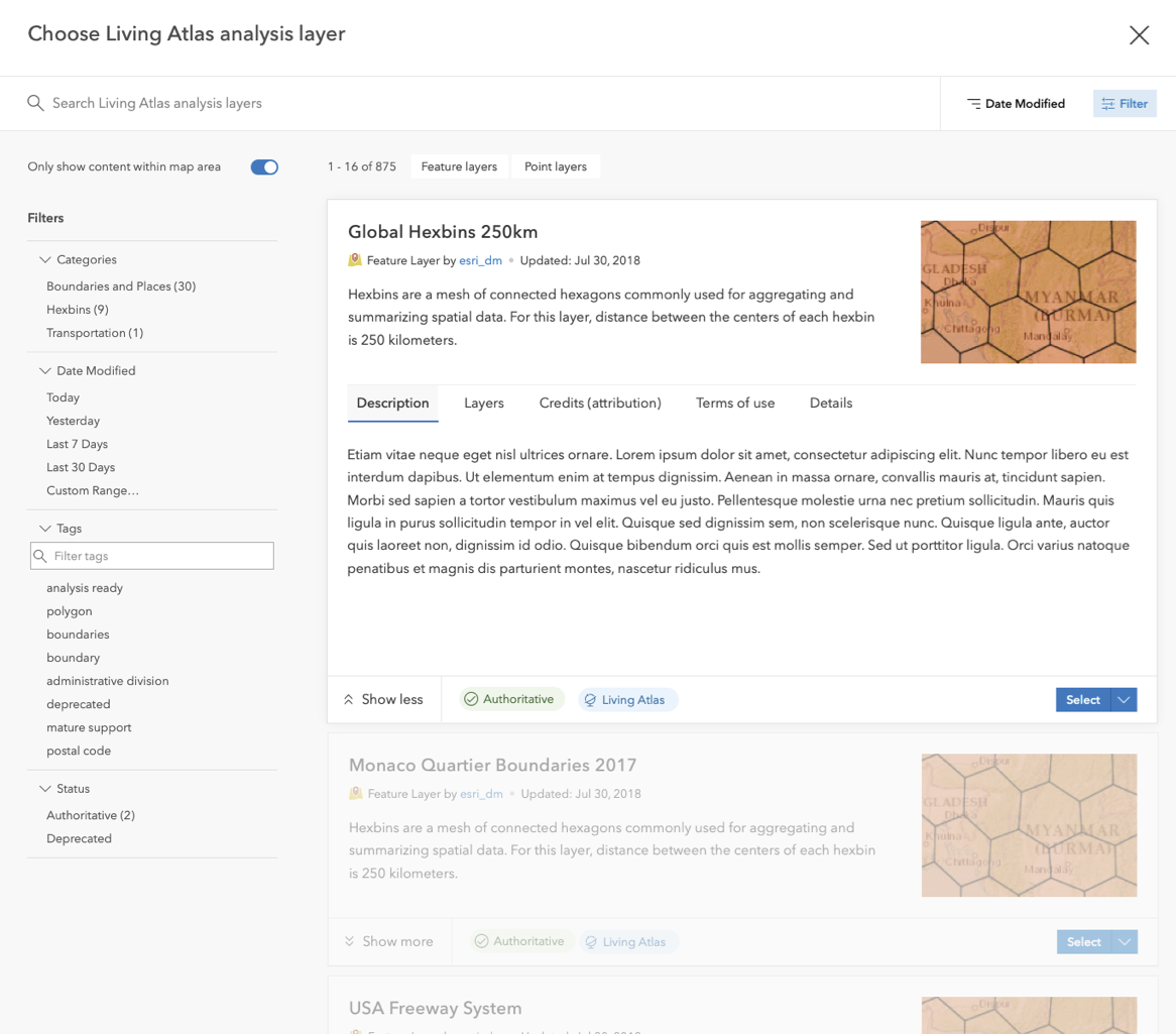 Many patterns and relationships are not always obvious by looking at a map. ArcGIS Online provides powerful analysis tools that quantify patterns and relationships and display results in the map. During the analysis workflow, users often need to add additional, unfamiliar layers to the map. Before the new design, users interacted with a legacy dialog that did not have filters and lacked a lot of important information of the layers.